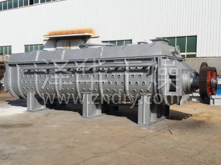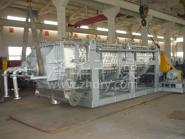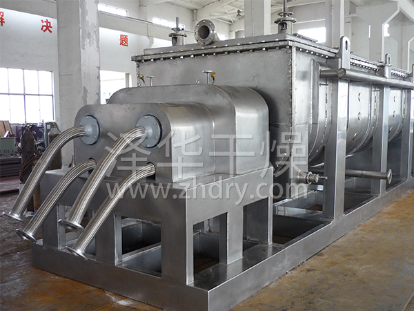 空心軸上密集排列著楔型中空漿葉,熱介質經空心軸流經漿葉。單位有效容積內傳熱面積很大,熱介質溫度從-40℃到320℃,可以是水蒸汽,也可以是液體型:如熱水、導熱油等。間接傳導加熱,沒有攜帶空氣帶走熱量,熱量均用來加熱物料。熱量損失僅為通過器體保溫層向環境的散熱。楔型漿葉傳熱面具有自清潔功能。物料顆粒與楔型面的相對運動產生洗刷作用,能夠洗刷掉楔型面上附著物料,使運轉中一直保持著清潔的傳熱面。漿葉干燥機的殼體為Ω型,殼體內一般安排二到四根空心攪拌軸。殼體有密封端蓋與上蓋,防止物料粉塵外泄而充分發揮作用。